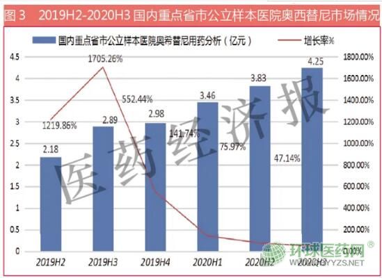 據阿斯利康年報,2019年全球奧希替尼銷售額為31.89億美元,同比上一年增長率為71.45%,該藥是阿斯利康銷售額居首位的品種。據米內網數據,2020年1-3季度,國內重點省市公立醫(yī)院奧希替尼用藥金額為11.54億元,較上一年同期增長了77.6%。從2019年國內公立醫(yī)院用藥金額排行榜的第29位前移到2020年1-3季度的第11位。