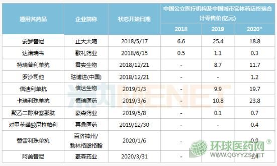 其中,有10款1類創(chuàng)新藥上市后銷售額增長迅速,其中正大天晴的安羅替尼表現(xiàn)最為亮眼,自2018年10月進入醫(yī)保后就立刻實現(xiàn)了放量效應(yīng)——2019年在中國公立醫(yī)療機構(gòu)終端銷售額超過20億元。