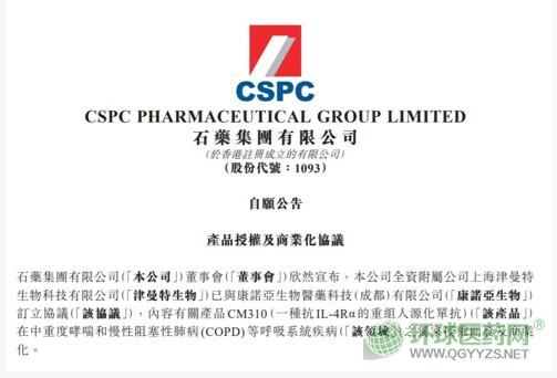 石藥集團(tuán)日前發(fā)布公告,公司全資附屬公司上海津曼特生物科技有限公司與康諾亞生物醫(yī)藥科技(成都)有限公司(簡(jiǎn)稱“康諾亞生物”)訂立協(xié)議,內(nèi)容是關(guān)于產(chǎn)品CM310在中重度哮喘和慢性阻塞性肺。–OPD)等呼吸系統(tǒng)疾病的獨(dú)家授權(quán)開(kāi)發(fā)及商業(yè)化。