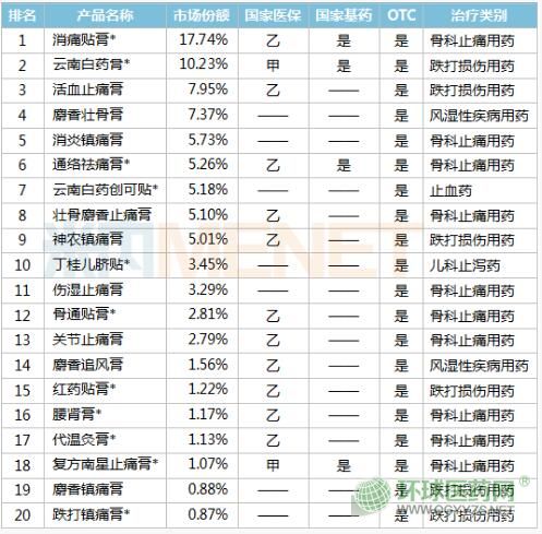 2020E重點城市實體藥店中成藥貼膏劑產(chǎn)品TOP20