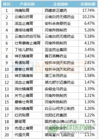 從品牌TOP20來看,西藏奇正藏藥的消痛貼膏、云南白藥無錫藥業(yè)的云南白藥膏、安科余良卿藥業(yè)的活血止痛膏位居前三,河南羚銳制藥的通絡(luò)祛痛膏、壯骨麝香止痛膏、關(guān)節(jié)止痛膏等5個產(chǎn)品躋身品牌TOP20。