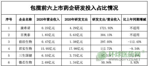 萬得數(shù)據(jù)統(tǒng)計(jì)顯示,截至4月9日,A股兩市共有1200多家公司披露了2020年的研發(fā)投入狀況。從研發(fā)投入占營業(yè)收入比例這一指標(biāo)的排序情況來看,生物醫(yī)藥企業(yè)全攬前六席。