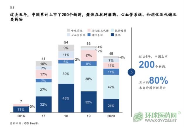在已經(jīng)上市的200個(gè)創(chuàng)新藥品種中,跨國(guó)藥企占到了156個(gè),高達(dá)80%;但是隨著時(shí)間的推移,創(chuàng)新藥的多元性有所提升——2010-2015年間 ,抗腫瘤藥占比高達(dá)47 %,而到了2016-2020年,神經(jīng)系統(tǒng)、消化道及代謝藥物、心血管和呼吸系統(tǒng)的藥物數(shù)量逐漸增加,抗腫瘤藥物占比下降至33%。
