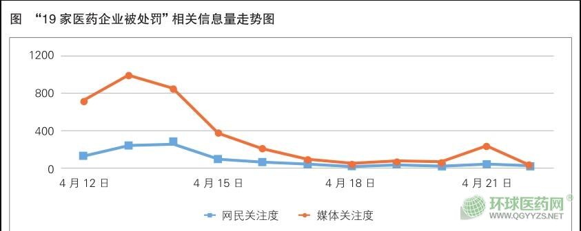 4月12日—22日,中國(guó)健康傳媒集團(tuán)食品藥品輿情監(jiān)測(cè)系統(tǒng)對(duì)主流媒體、全國(guó)性門(mén)戶(hù)網(wǎng)站、微博、微信等平臺(tái)進(jìn)行監(jiān)測(cè)發(fā)現(xiàn),“19家醫(yī)藥企業(yè)被處罰”相關(guān)話(huà)題受到輿論較多關(guān)注,相關(guān)輿情熱度較高。