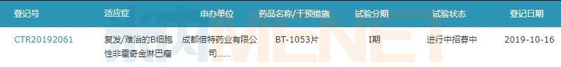 米內(nèi)網(wǎng)數(shù)據(jù)顯示,成都倍特藥業(yè)|成都海博銳藥業(yè)于2018年9月提交了1類新藥BT-1053片的臨床申請(qǐng),隨后獲得批準(zhǔn),擬進(jìn)行臨床的適應(yīng)癥為:單藥治療既往至少接受過一種治療的套細(xì)胞淋巴瘤(MCL)患者;其他存在BCR通路異常的B細(xì)胞類型惡性腫瘤,如慢性淋巴細(xì)胞白血。–LL)、濾泡性淋巴瘤(FL)、原發(fā)性巨球蛋白血癥(WM)和彌漫性大B細(xì)胞淋巴瘤(DLBCL)。目前該新藥的復(fù)發(fā)/難治的B細(xì)胞性非霍奇金淋巴瘤Ⅰ期臨床正在進(jìn)行中。
