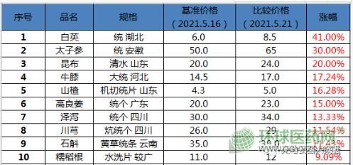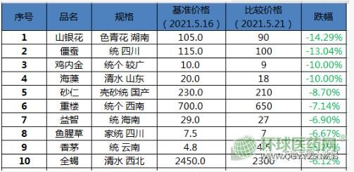 2021年5月16-21日,天地云圖中藥產(chǎn)業(yè)大數(shù)據(jù)中心監(jiān)控的1587個品種(包括相同品種不同品規(guī)不同產(chǎn)地,下同)中,上漲品種數(shù)50個,下跌品種數(shù)38個,其余商品本周價格波動不大。