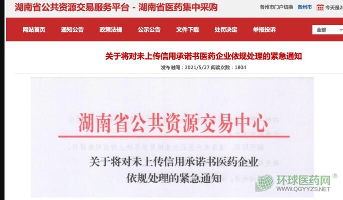 5月27日,湖南省公共資源交易中心發(fā)布《關于將對未上傳信用承諾書醫(yī)藥企業(yè)依規(guī)處理的緊急通知》。湖南表示,截止2021年5月26日,仍有少數(shù)醫(yī)藥企業(yè)未上傳信用承諾書,明確至2021年6月1日前仍未提交信用承諾書的醫(yī)藥企業(yè),將按照相關規(guī)定處理。針對其中的生產(chǎn)企業(yè)(含國內(nèi)總代),湖南將停用其全部中標(掛網(wǎng))產(chǎn)品并關閉交易系統(tǒng)功能。
