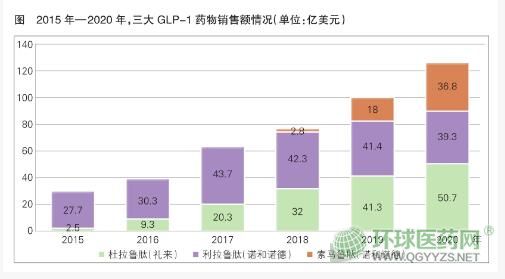 2014年,禮來的杜拉魯肽上市,短短6年后便成為銷售額高達(dá)50億美元的重磅藥物,一躍成為GLP-1類藥物銷售冠軍(詳見圖)。2009年,諾和諾德的利拉魯肽上市,該藥曾經(jīng)是GLP-1類藥物銷售冠軍,銷售額在2017年巔峰時曾達(dá)到43.7億美元,但2020年數(shù)據(jù)顯示,該藥市場已進(jìn)入下滑期。同樣是諾和諾德旗下,索馬魯肽則增長迅速,3年時間成長為銷售額達(dá)37.2億美元的又一重磅藥物,該藥有注射劑和口服制劑兩個劑型。