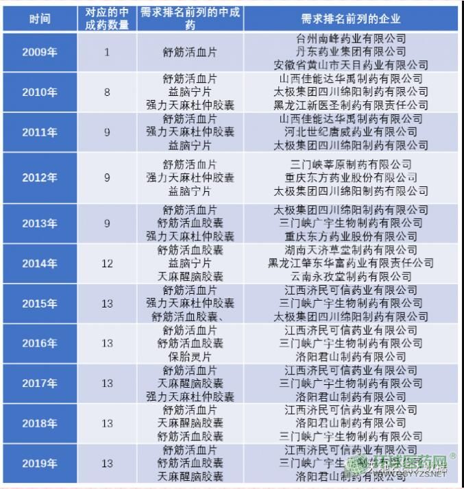 表2:歷年槲寄生需求排名前列的中成藥和生產(chǎn)企業(yè)