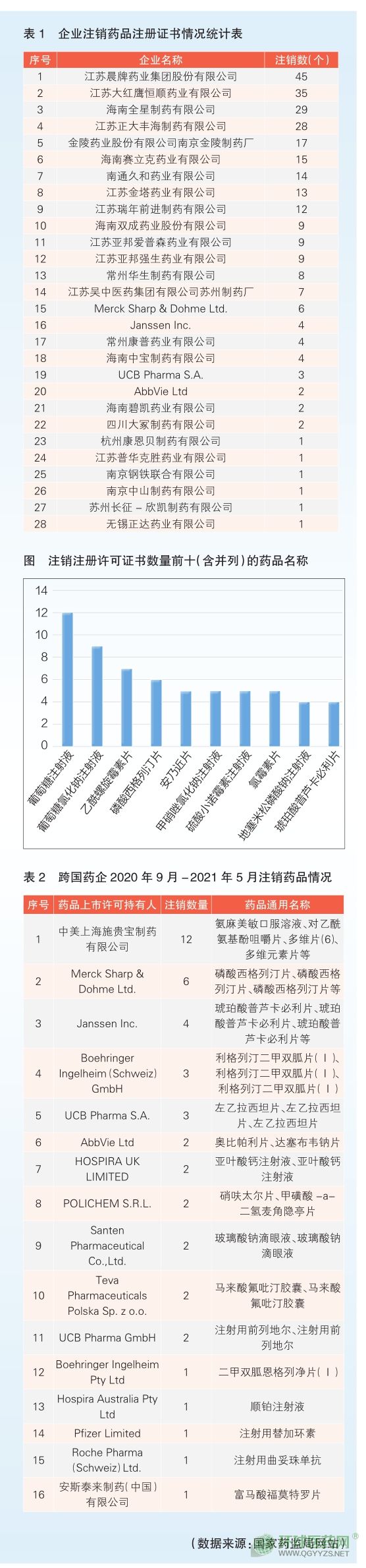 根據(jù)《公告》,上述283個(gè)藥品注冊證書涉及28家企業(yè),包括24家國內(nèi)企業(yè)和4家跨國藥企。其中,注銷藥品注冊證書數(shù)量排名前五(含并列,共12家)的企業(yè)分別為江蘇晨牌藥業(yè)集團(tuán)股份有限公司、江蘇大紅鷹恒順?biāo)帢I(yè)有限公司、海南全星制藥有限公司、江蘇正大豐海制藥有限公司、金陵藥業(yè)股份有限公司南京金陵制藥廠(見表1)。