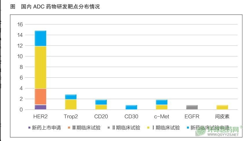 目前,國內(nèi)暫無國產(chǎn)ADC藥物獲批上市,榮昌生物的緯迪西妥單抗是國內(nèi)首個提交新藥上市申請的自主研發(fā)ADC藥物,擬用于治療局部晚期或轉(zhuǎn)移性胃癌,另有多家企業(yè)的ADC藥物正處于臨床研究或新藥臨床試驗申請階段。HER2成為國內(nèi)企業(yè)ADC藥物扎堆開發(fā)的靶點,國內(nèi)有15款在研ADC產(chǎn)品的靶點為HER2(詳見圖),該靶點賽道的競爭十分激烈。其中,東曜藥業(yè)的注射用TAA013、浙江醫(yī)藥的ARX788等均已進入Ⅲ期臨床試驗,適應(yīng)癥均為乳腺癌。此外,我國已有針對EGFR靶點的ADC藥物進入Ⅱ期臨床試驗;針對Trop2、CD20、c-Met、間皮素等靶點的ADC藥物最高進展為Ⅰ期臨床試驗。