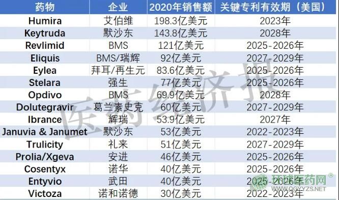 除全球前四暢銷藥,禮來、安進、諾華、武田、諾和諾德都有2020年銷售額在30億美元以上的產(chǎn)品將在未來十年專利到期。