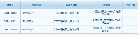 8月10日,CDE官網(wǎng)顯示,東陽光藥的1類新藥HEC93077片獲得臨床試驗默示許可,擬用于治療痛風伴高尿酸血癥。米內(nèi)網(wǎng)數(shù)據(jù)顯示,2020年中國公立醫(yī)療機構及中國城市實體藥店終端抗痛風制劑銷售額突破30億元。2021年至今,東陽光已有6款1類新藥獲批臨床。
