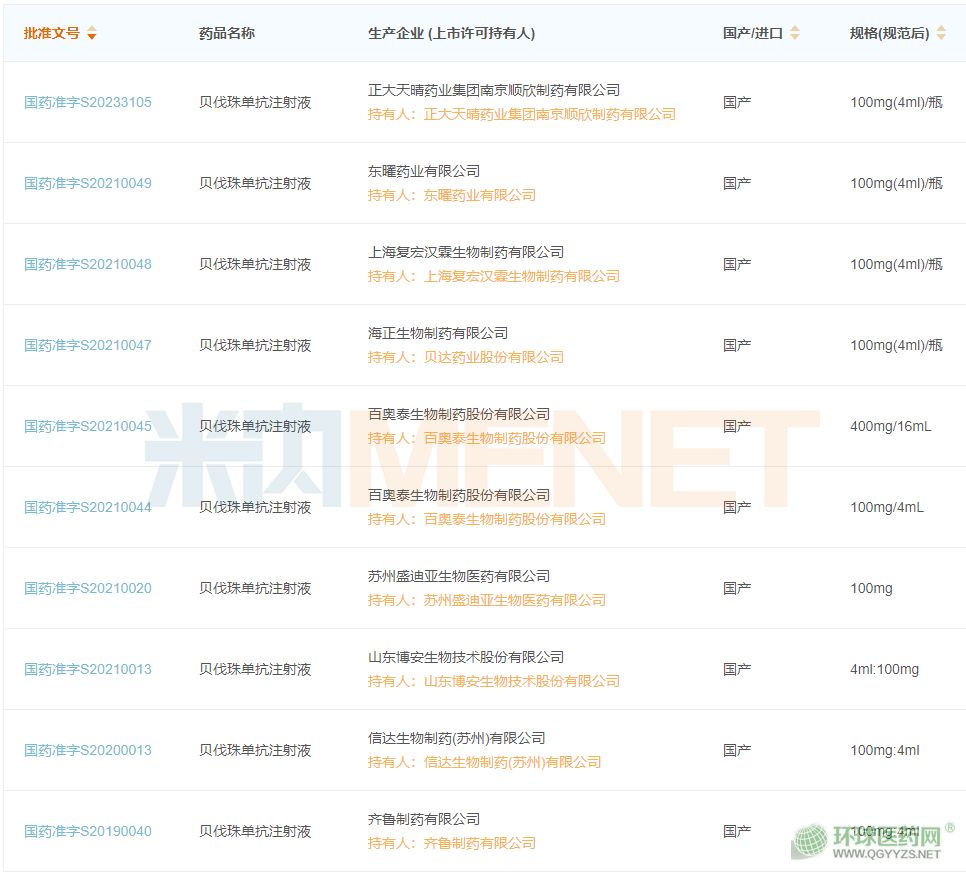 根據(jù)米內(nèi)網(wǎng)數(shù)據(jù),含原研廠家在內(nèi),國內(nèi)已有10家藥企擁有貝伐珠單抗注射液生產(chǎn)批文。其中,貝伐珠單抗生物類似藥國產(chǎn)前五家分別為齊魯制藥、信達(dá)生物、博安生物、恒瑞醫(yī)藥以及百奧泰。且另有多家藥企正處于注冊申請或臨床試驗階段,市場競爭十分激烈。