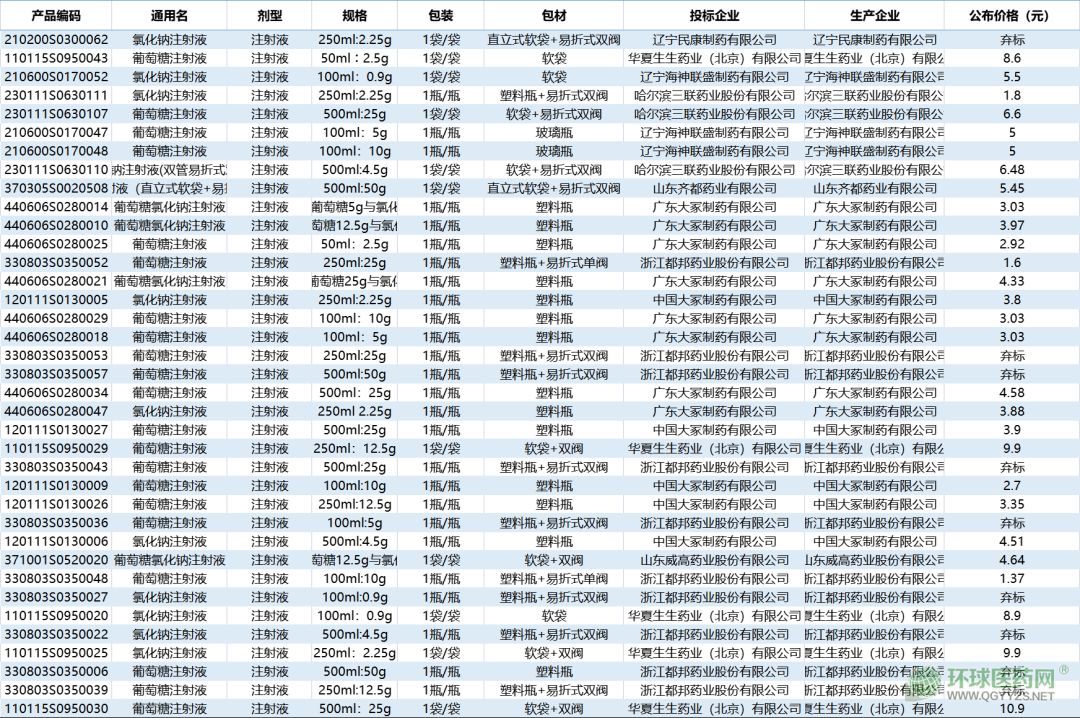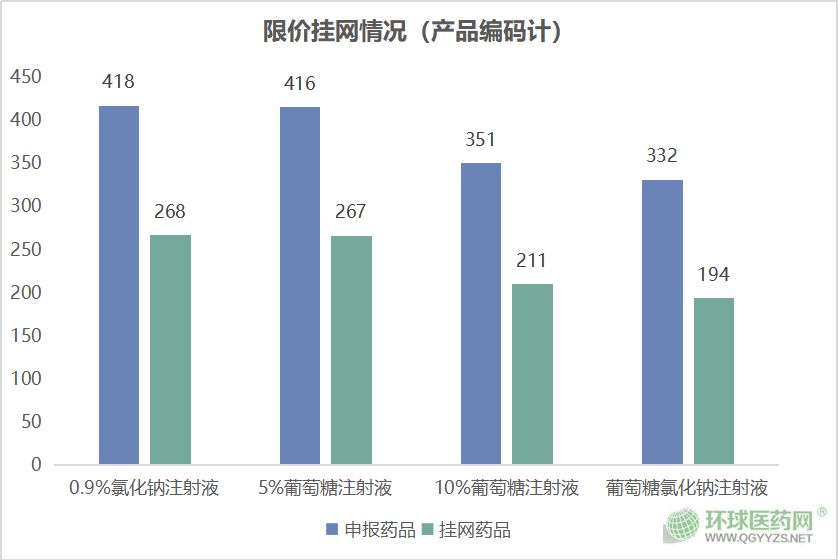 公布的結(jié)果中,0.9%氯化鈉注射液和5%葡萄糖注射液的限價掛網(wǎng)藥品最多,分別為268和267個。