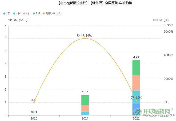 目前,富馬酸伏諾拉生片在國(guó)內(nèi)還處于前期擴(kuò)張模式,據(jù)藥融云統(tǒng)計(jì),該藥2021年在院內(nèi)銷售額達(dá)1.57億元,2022年同比增長(zhǎng)173.43%,銷售額達(dá)到4.29億,前景可觀。