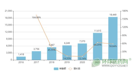 米內(nèi)數(shù)據(jù)庫顯示,近年來,硫代硫酸鈉銷售額迅速上漲,2016年中國城市公立醫(yī)院銷售額僅為1400萬元,2021年突破1億元,2022年中國城市公立醫(yī)院銷售額超過1.8億元,2021年、2022年年增長率分別達64%和59%,市場前景可觀。