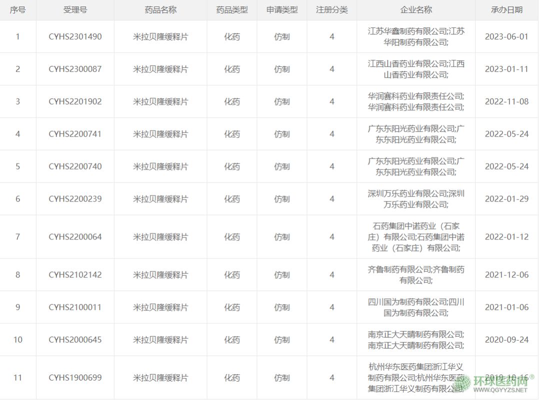 另外,根據(jù)CDE官網(wǎng),目前還有6家國(guó)內(nèi)企業(yè)包括江蘇華鑫制藥、江西山香藥業(yè)、華潤(rùn)賽科藥業(yè)、廣東東陽(yáng)光藥業(yè)、深圳萬(wàn)樂(lè)藥業(yè)和齊魯制藥提交了米拉貝隆緩釋片的上市申請(qǐng),處于審評(píng)審批階段,今年應(yīng)該繼續(xù)有新廠家獲批。