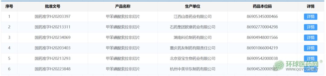 截至目前,除了原研廠家拜耳外,國內(nèi)市場已經(jīng)有6家企業(yè)獲得了甲苯磺酸索拉非尼片生產(chǎn)批文,包括江西山香藥業(yè)、重慶藥友制藥、亞寶藥業(yè)、石藥集團、杭州中美華東制藥、科倫藥業(yè)。