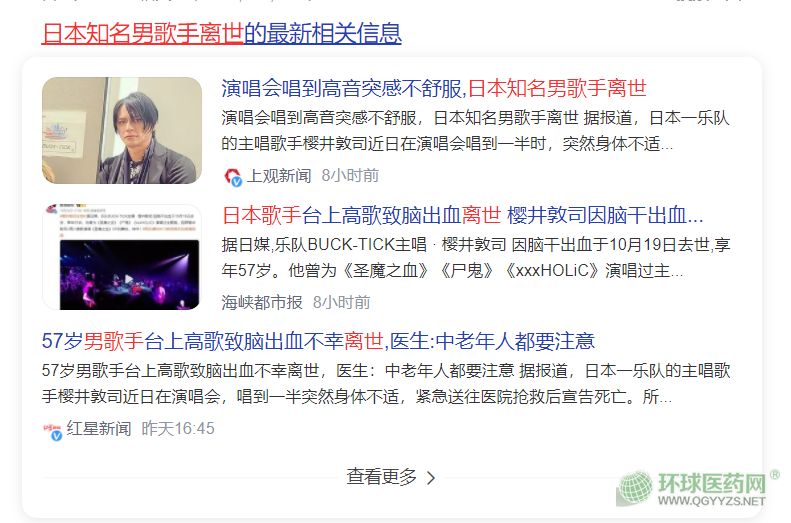 據(jù)報(bào)道,日本一樂隊(duì)的主唱歌手櫻井敦司近日在演唱會(huì),唱到一半突然身體不適,緊急送往醫(yī)院搶救后宣告死亡。所屬經(jīng)紀(jì)公司于10月24日發(fā)出聲明,證實(shí)櫻井敦司因腦干出血去世,享年57歲。