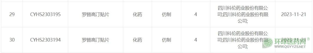 11月21日,國家藥品監(jiān)督管理局(CDE)官網(wǎng)顯示,四川科倫藥業(yè)按仿制4類提交的羅替高汀貼片上市申請(qǐng)獲CDE承辦受理。目前國內(nèi)尚未有羅替高汀貼片仿制藥獲批。