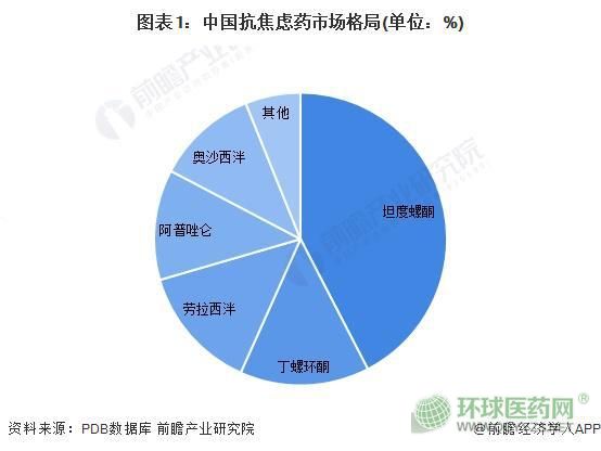 抗焦慮藥市場格局主要由8種藥物占據(jù),包括坦度螺酮、丁螺環(huán)酮、勞拉西泮、阿普唑侖、奧沙西泮、地西泮、復(fù)方地西泮、氯巴占。根據(jù)PDB數(shù)據(jù)庫的資料顯示,坦度螺酮的銷售額超過40%,市占率第一;丁螺環(huán)酮、勞拉西泮、阿普唑侖、奧沙西泮的市占率均超過10%,其他所有藥物總市占率約為6%左右。