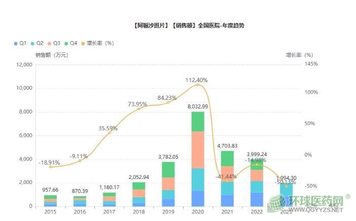 據(jù)藥融云數(shù)據(jù)統(tǒng)計顯示,2020年阿哌沙班片在全國院內(nèi)銷售達到最高峰值,超8000萬元,漲幅達112%。