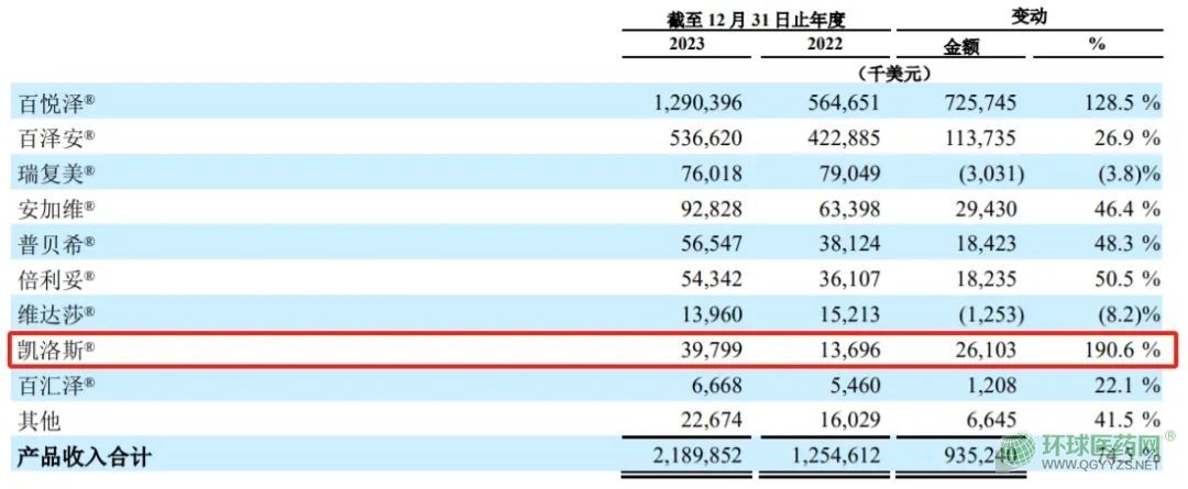 國內方面,2022年1月5日,卡非佐米正式在國內上市供應,商品名為凱洛斯。根據(jù)百濟神州最新年報,凱洛斯2022年銷售額為1369.6萬美元,2023年銷售額達3979.9萬美元(約合2.86億元人民幣),同比增長高達190.6%。