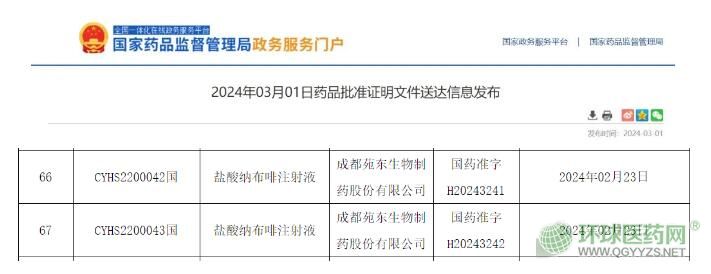 3月1日,國家藥品監(jiān)督管理局NMPA官網(wǎng)顯示,成都苑東生物制藥的鹽酸納布啡注射液獲批上市,視同通過一致性評(píng)價(jià),該產(chǎn)品為國內(nèi)第4家。
