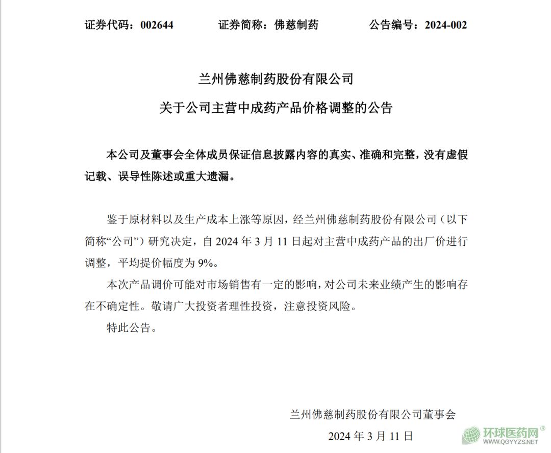 3月11日,佛慈制藥發(fā)布公告,鑒于原材料以及生產(chǎn)成本上漲等原因,自2024年3月11日起對主營中成藥產(chǎn)品的出廠價進行調(diào)整,平均提價幅度為9%。
