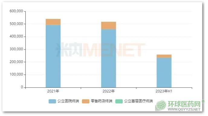 根據(jù)米內(nèi)網(wǎng)數(shù)據(jù)顯示,2022年在中國三大終端六大市場利妥昔單抗注射液的合計銷售額在50億元以上,公立醫(yī)院終端(城市公立醫(yī)院+縣級公立醫(yī)院)是該產(chǎn)品的銷售主陣地,2023年上半年跌幅收窄至0.49%。