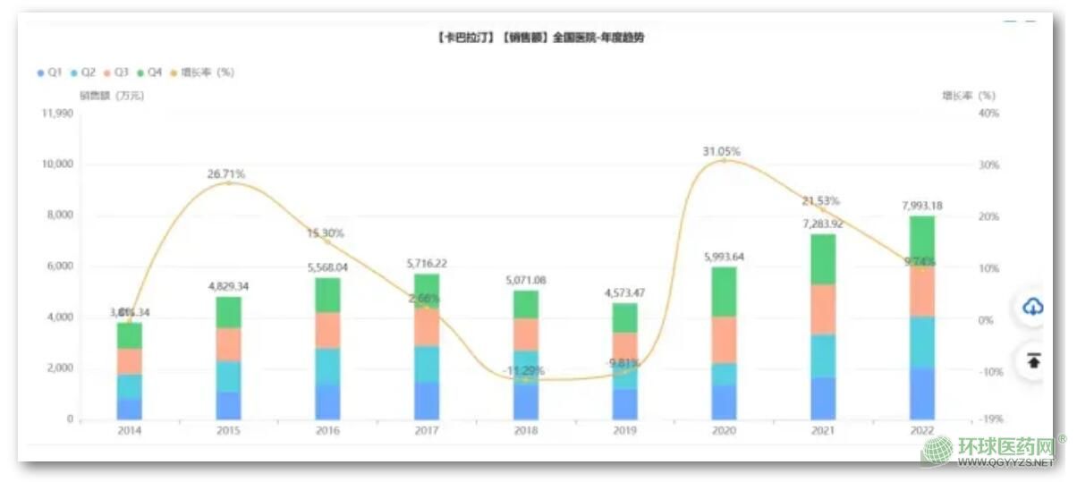 據(jù)藥融云數(shù)據(jù),重酒石酸卡巴拉汀近年在全國醫(yī)院處于上漲趨勢,2021年銷售額達(dá)7000萬元,其中諾華制藥占據(jù)了六成市場。2022年銷售額上漲至近8000萬元,同比增長10%,市場前景可觀。