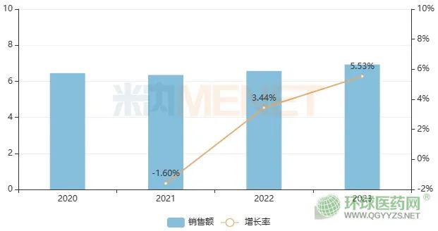 米內網數(shù)據顯示,鹽酸羥考酮緩釋片近年在中國城市公立醫(yī)院、縣級公立醫(yī)院、城市社區(qū)中心及鄉(xiāng)鎮(zhèn)衛(wèi)生院(簡稱中國公立醫(yī)療機構)終端均保持6億元銷售規(guī)模,2023年同比增長5.53%,是止痛藥TOP8產品。