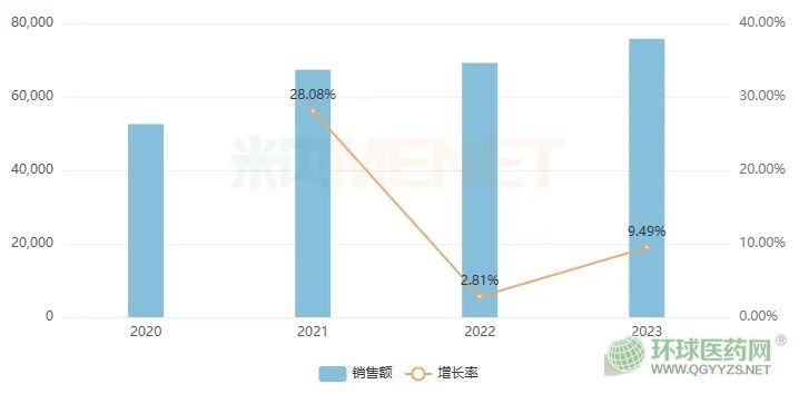 米內(nèi)網(wǎng)數(shù)據(jù)顯示,2023年,瑞巴派特片在中國公立醫(yī)療機構(gòu)終端銷售額超過7.5億元,增長率為9.49%。