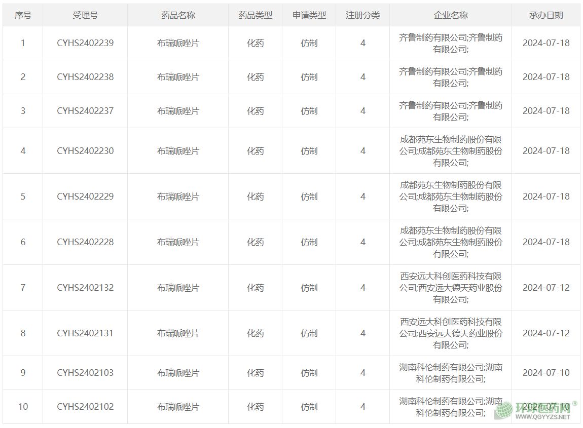 在國內(nèi)市場,大冢制藥于2022年12月首次提交布瑞哌唑片上市申請獲受理,并于2024年6月獲批進(jìn)口。根據(jù)國家藥品審評中心官網(wǎng)檢索顯示,目前國內(nèi)有齊魯制藥、成都苑東生物制藥、西安遠(yuǎn)大科創(chuàng)醫(yī)藥|西安遠(yuǎn)大德天藥業(yè)、湖南科倫制藥4家企業(yè)提交布瑞哌唑片仿制藥上市申請。
