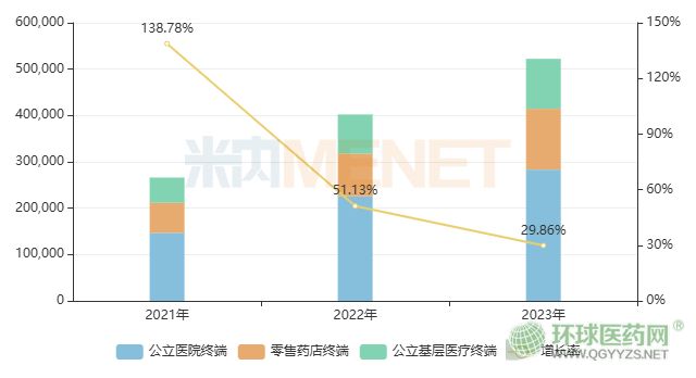 進(jìn)入國內(nèi)市場后,達(dá)格列凈的銷售額一路高歌猛進(jìn)。米內(nèi)網(wǎng)數(shù)據(jù)顯示,2023年在中國三大終端六大市場,達(dá)格列凈片的合計銷售額已超過52億元,其中在公立醫(yī)院終端(城市公立醫(yī)院+縣級公立醫(yī)院)銷售額超過28億元,在零售藥店終端(城市實體藥店+網(wǎng)上藥店)以及公立基層醫(yī)療終端(城市社區(qū)中心+鄉(xiāng)鎮(zhèn)衛(wèi)生院)均首次突破10億元。