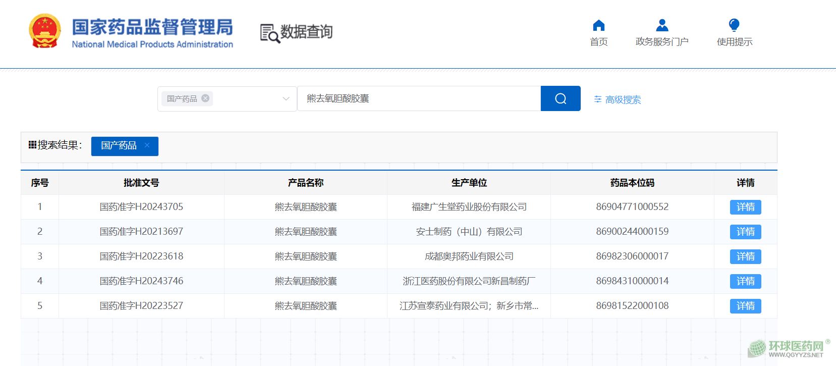 根據(jù)國(guó)家藥品監(jiān)督管理局官網(wǎng)檢索顯示,國(guó)內(nèi)市場(chǎng)已有6家企業(yè)的熊去氧膽酸膠囊獲批上市,包括原研企業(yè)Dr. Falk、安士制藥(中山)、江蘇宣泰醫(yī)藥、成都奧邦藥業(yè)、福建廣生堂藥業(yè)、浙江醫(yī)藥股份有限公司新昌制藥廠。