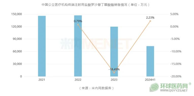 米內網數(shù)據顯示,2023年中國城市公立醫(yī)院、縣級公立醫(yī)院、城市社區(qū)中心以及鄉(xiāng)鎮(zhèn)衛(wèi)生院(簡稱中國公立醫(yī)療機構)終端注射用鹽酸羅沙替丁醋酸酯銷售額接近12億元,2024年上半年其銷售額超過7億元。 中國公立醫(yī)療機構終端注射用鹽酸羅沙替丁醋酸酯銷售情況(單位:萬元)
