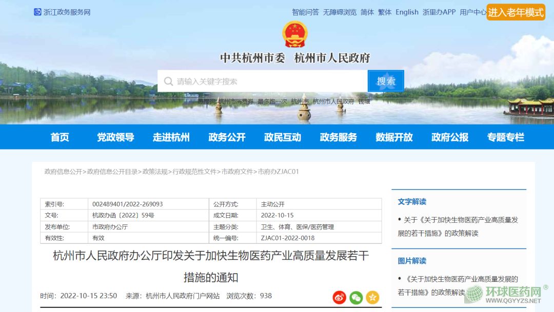 10月15日,杭州發(fā)布《杭州市人民政府辦公廳關(guān)于加快生物醫(yī)藥高質(zhì)量發(fā)展的若干措施》;搶抓產(chǎn)業(yè)發(fā)展戰(zhàn)略機(jī)遇期,形成具有全球影響力的生物醫(yī)藥研發(fā)制造產(chǎn)業(yè)發(fā)展高地。
