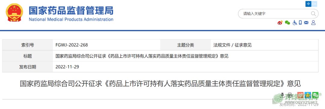 為督促藥品上市許可持有人落實(shí)藥品質(zhì)量主體責(zé)任,進(jìn)一步加強(qiáng)藥品全生命周期質(zhì)量監(jiān)督管理,國家藥監(jiān)局組織起草了《藥品上市許可持有人落實(shí)藥品質(zhì)量主體責(zé)任監(jiān)督管理規(guī)定(征求意見稿)》,現(xiàn)向社會公開征求意見。請于2022年12月9日前,將有關(guān)意見反饋至電子郵件yaopinjianguan-2 nmpa.gov.cn,郵件標(biāo)題請注明“落實(shí)持有人主體責(zé)任管理規(guī)定意見反饋”。