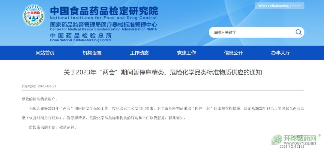 2023年2月21日,中檢院消息,從2023年3月1日零時起至兩會結(jié)束(恢復(fù)時間另行通知),暫停麻精類、危險化學(xué)品類標(biāo)準(zhǔn)物質(zhì)的訂購和上門取貨服務(wù)。特此通知。