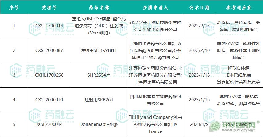 近日,據(jù)藥融云數(shù)據(jù),根據(jù)國家藥品監(jiān)督管理局藥品審評中心(CDE)公示時間計算,2023年已經(jīng)有5個藥品被納入突破性治療品種,分別是濱會生物的重組人GM-CSF溶瘤II型單純皰疹病毒(OH2)注射液(Vero細胞)、恒瑞醫(yī)藥的注射用SHR-A1811和SHR2554片、科倫藥業(yè)的注射用SKB264、禮來的Donanemab注射液。