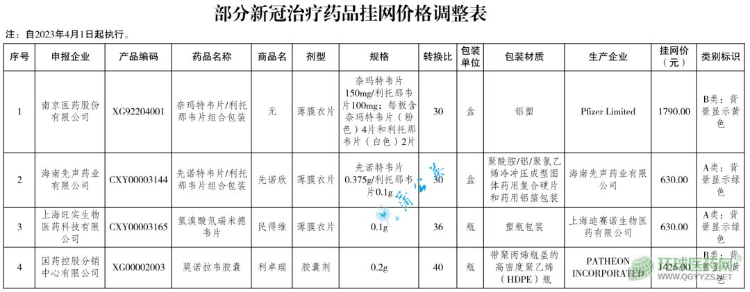 2023年03月31日,江蘇、甘肅公共資源中心發(fā)布了調(diào)整“新冠治療”藥品掛網(wǎng)價(jià)格通知,涉及奈瑪特韋片/利托那韋片、氫溴酸氘瑞米德韋片、先諾特韋片/利托那韋片組合包裝、莫諾拉韋膠囊、阿茲夫定片。