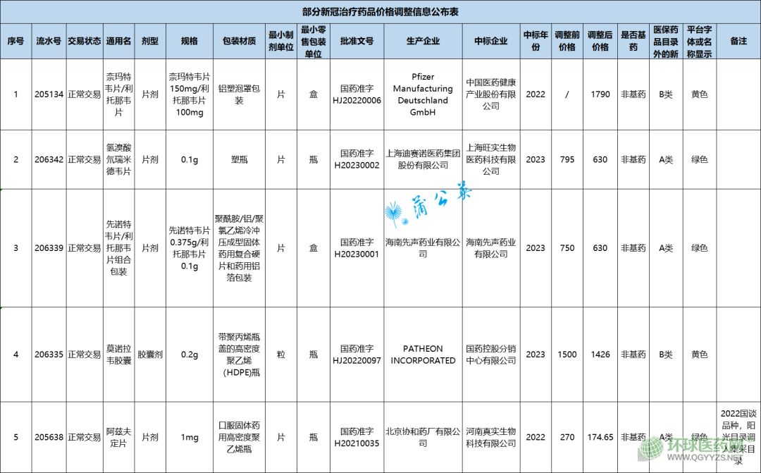 按照國(guó)家醫(yī)保局辦公室《關(guān)于完善新冠治療藥品價(jià)格形成機(jī)制實(shí)施分類(lèi)管理的通知》要求及首發(fā)報(bào)價(jià)省份評(píng)估調(diào)整結(jié)果,經(jīng)企業(yè)申報(bào),現(xiàn)對(duì)5個(gè)新冠治療藥品價(jià)格予以調(diào)整,具體如下:
