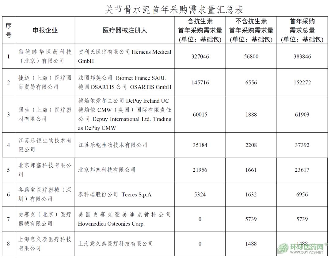 如前所述,本次集中帶量采購(gòu)產(chǎn)品為獲得中華人民共和國(guó)醫(yī)療器械注冊(cè)證并許可上市的關(guān)節(jié)骨水泥類(lèi)醫(yī)用耗材,首年采購(gòu)需求量按參加本次集中帶量采購(gòu)的每一家醫(yī)療機(jī)構(gòu)報(bào)送的采購(gòu)需求量累加得出,以20g 粉末所對(duì)應(yīng)的關(guān)節(jié)骨水泥產(chǎn)品為1 個(gè)“基礎(chǔ)包”統(tǒng)計(jì)。