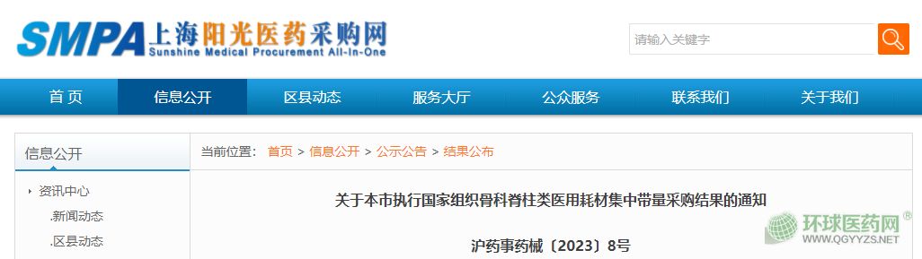 昨日,上海陽光醫(yī)藥采購網(wǎng)發(fā)布《關(guān)于本市執(zhí)行國家組織骨科脊柱類醫(yī)用耗材集中帶量采購結(jié)果的通知滬藥事藥械〔2023〕8號》(簡稱《通知1》)。