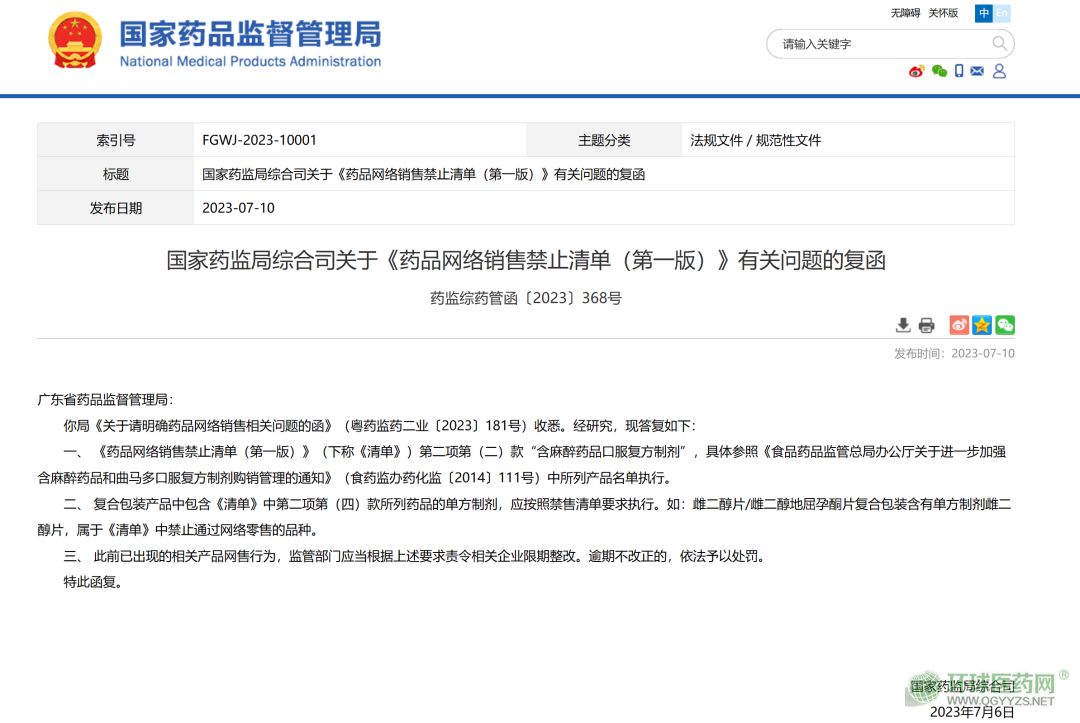7月10日,國家藥監(jiān)局綜合司發(fā)布了關(guān)于《藥品網(wǎng)絡(luò)銷售禁止清單(第一版)》(下稱《清單》)有關(guān)問題的復(fù)函。這次是針對 《清單》第二項(xiàng)中的含麻醉藥品口服復(fù)方制劑、右美沙芬口服單方制劑內(nèi)容的答復(fù):