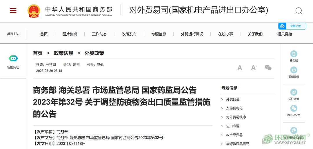 8月29日,商務(wù)部、海關(guān)總署、市場監(jiān)管總局、國家藥監(jiān)局聯(lián)合印發(fā)了關(guān)于調(diào)整防疫物資出口質(zhì)量監(jiān)管措施的公告,自本公告發(fā)布之日起,對非醫(yī)用口罩、新型冠狀病毒檢測試劑、醫(yī)用口罩、醫(yī)用防護服、呼吸機、紅外體溫計等六大類防疫物資產(chǎn)品出口質(zhì)量監(jiān)管措施作出調(diào)整。