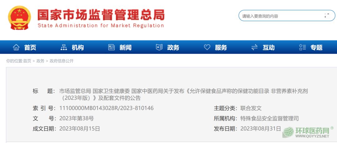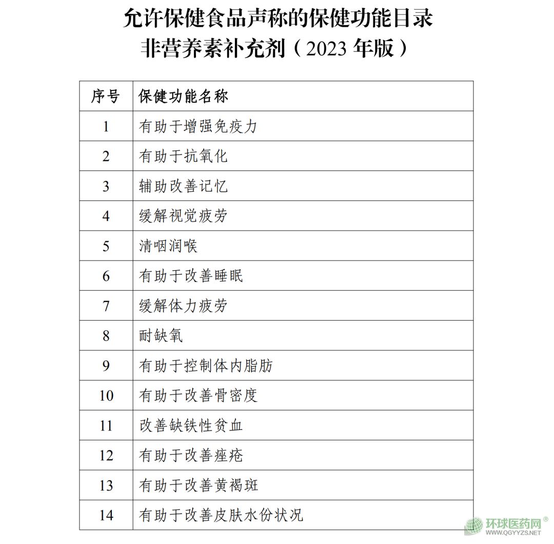 8月31日,國家市場監(jiān)督管理總局網(wǎng)站消息,市場監(jiān)管總局、國家衛(wèi)生健康委、國家中醫(yī)藥局聯(lián)合發(fā)布《允許保健食品聲稱的保健功能目錄非營養(yǎng)素補(bǔ)充劑(2023年版)》及配套文件公告。