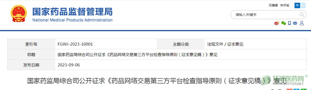 9月6日,國家藥監(jiān)局官網(wǎng)發(fā)文,國家藥監(jiān)局綜合司公開征求《藥品網(wǎng)絡(luò)交易第三方平臺檢查指導(dǎo)原則(征求意見稿)》意見。